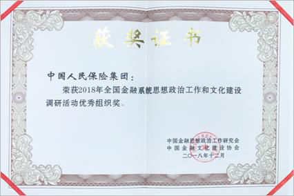 近年来,集团公司党委高度重视文化专业力建设,持续深入开展思想政治工作和企业文化建设工作,涌现出一大批贴近实际、方法科学、质量较高的理论与实务研究成果。2011年以来,集团公司组织全系统积极参加中国金融政研会相关课题研究成果评选工作,有力促进了成果的对内对外传播。八年来,全系统累计获奖成果81篇。其中,6篇一等奖,10篇二等奖,21篇三等奖,44篇优秀奖。这些获奖成果是中国人民保险全系统文化建设领域专业化提升的集中体现,为全系统乃至全国保险金融企业抓好企业文化建设和思想政治建设提供了标杆和参照。
