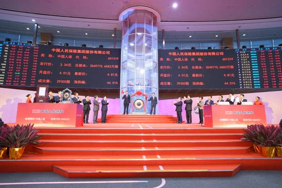 2018年11月16日上午9:30,随着上海证券交易所鸣锣开市,中国人民保险集团股份有限公司(股票简称“中国人保” 股票代码:601319)正式登陆A股市场,成为国内第五家A+H股两地上市的金融保险企业,标志着中国人保自2012年港股上市以来,开启资本市场新征程。中国人保A股公开交易首日开盘4.01元,开盘后随即封住涨停,最新价为4.81元,涨幅达到44.01%。