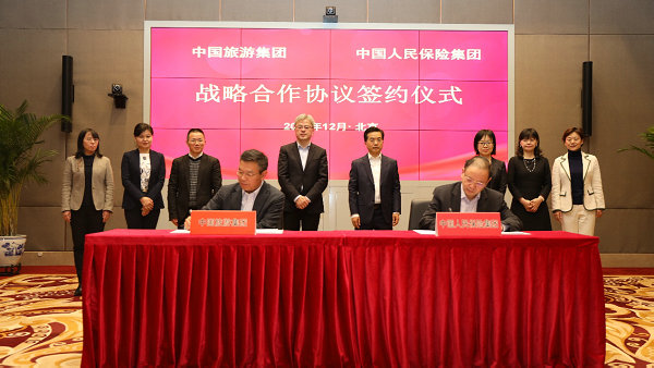 2019年12月23日下午,中国人民保险集团与中国旅游集团在北京签署战略合作协议,集团公司缪建民董事长与中旅集团万敏董事长出席签约仪式。集团公司肖建友副总裁与中旅集团马王军总会计师代表双方签署协议。人保资产、人保香港相关负责人,集团公司业务管理部/精算部、投资管理部负责人;中旅集团财务部、旅行服务事业群、战略投资和企业发展管理部等部门相关负责人参加签约仪式。