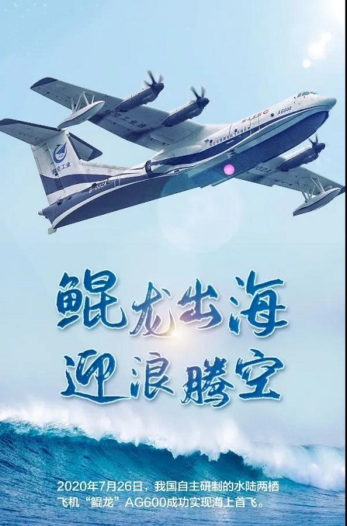 2020年7月26日,由中国人民保险集团承保的大型灭火/水上救援水陆两栖飞机“鲲龙”AG600在山东青岛附近海域,如一条东方巨龙,迎浪腾空,直插云霄,圆满完成海上首飞。