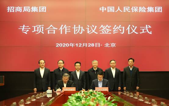 2020年12月28日下午,人保集团罗熹董事长与招商局集团董事长缪建民举行会谈,并共同出席双方《深化产融结合助力高质量发展专项合作协议》签约仪式。