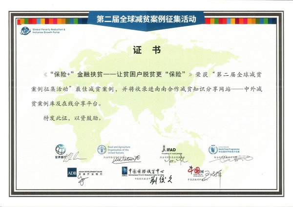 10月19日,由农业农村部、国家乡村振兴局主办的“2021乡村发展高层论坛”在京举行,会上同步发布第二届“全球减贫案例征集活动”获奖案例名单并颁奖,中国人保《“保险+”金融扶贫——让贫困户脱贫更“保险”》荣获最佳减贫案例。