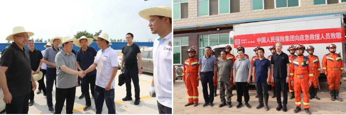 (左:人保集团党委书记、董事长王廷科同志专程赶到涿州查看受灾情况,看望慰问理赔一线员工,指导大灾理赔工作。右:看望国家安全生产应急救援中心中原油田救援队的同志。)