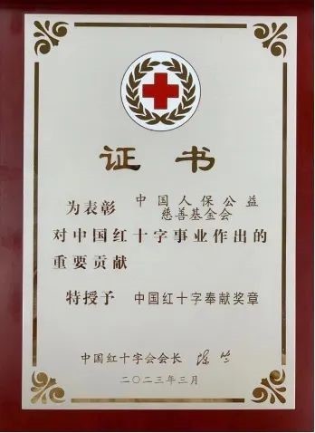 5月7日,为表彰对中国红十字事业作出的重要贡献,中国红十字会总会向中国人保公益慈善基金会颁发了“中国红十字奉献奖章”。