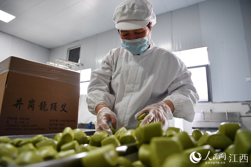 以艾草为主要原料的食品经过加工、摊凉、装箱,发往全国各地。(人民网 时雨摄)