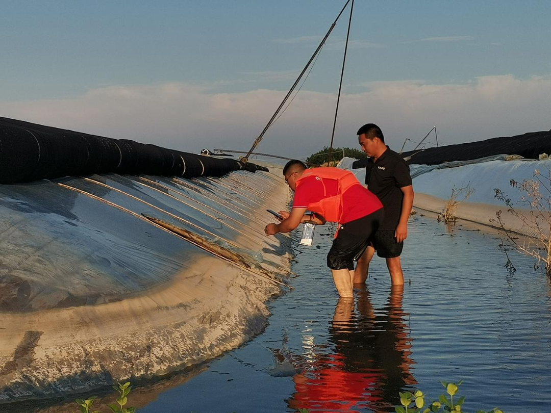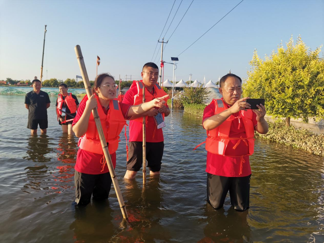 保险公司人员蹚着积水查看蔬菜大棚受损情况。杜俊颖摄