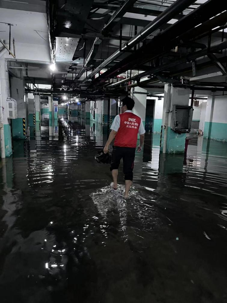 人保财险广东汕头市分公司组织理赔人员提前排查可能存在的风险地区40余个,走访各小区各单位,粘贴风险提示函,做好客户的风险提示,特别是地下车库等易积水地方,指引客户提前准备好防水沙包、抽水泵等物资的储备工作,及时消除安全隐患。同时对有需要的物业小区赠送防水沙包袋,目前已配送防灾防损800个。图为分公司理赔员赤脚查勘水淹地下车库。