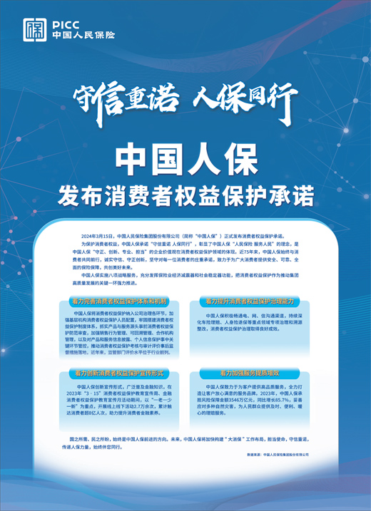 2024年3月15日,中国人民保险集团股份有限公司(简称“中国人保”)正式发布消费者权益保护承诺。