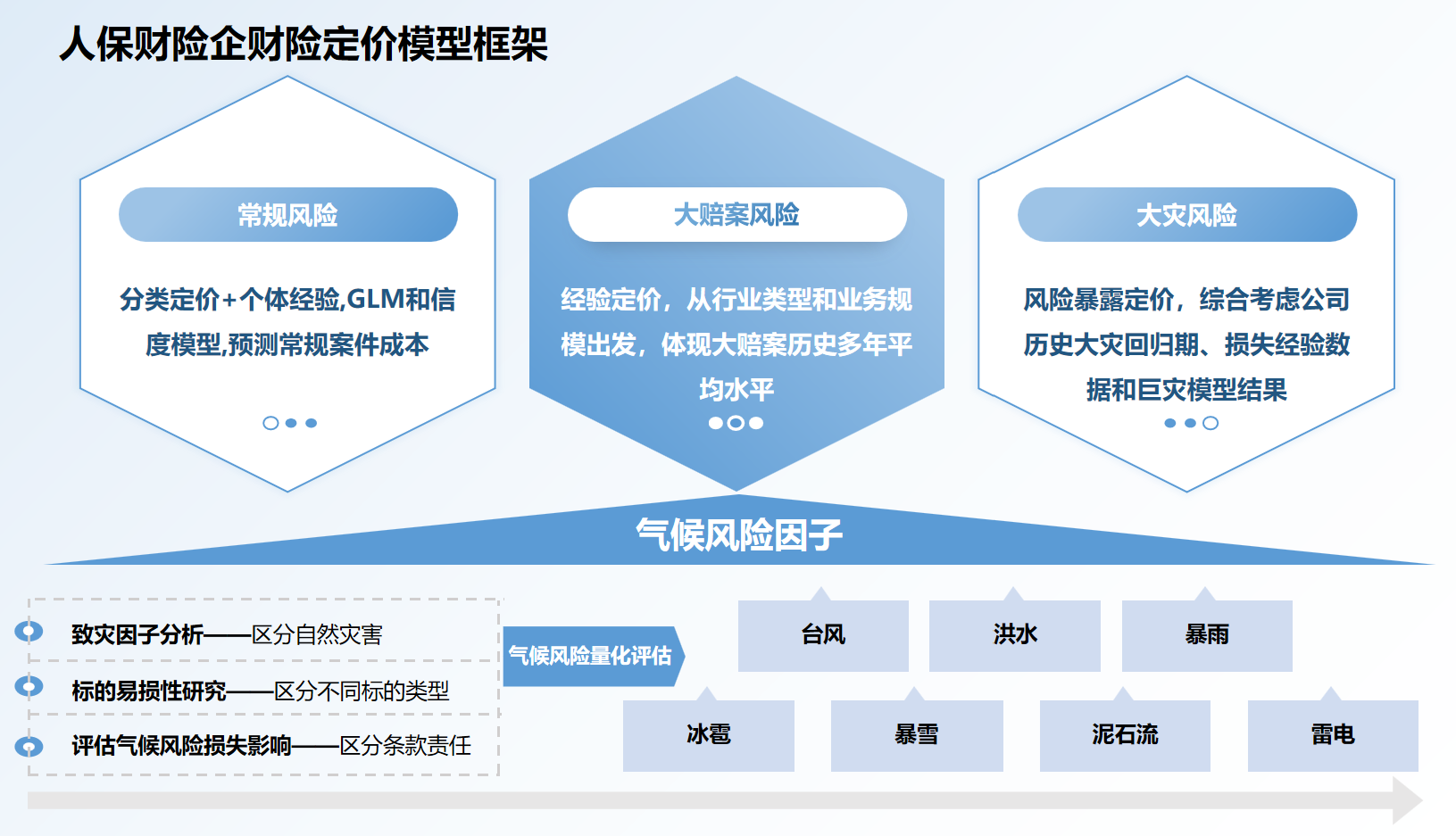 三是考虑不同条款责任,将气候风险模型嵌入精算定价模型,评估气候风险对保险损失的影响,测算不同标的台风、洪水、暴雨、雪灾、冰雹、雷电、泥石流等自然灾害风险的损失影响因子。