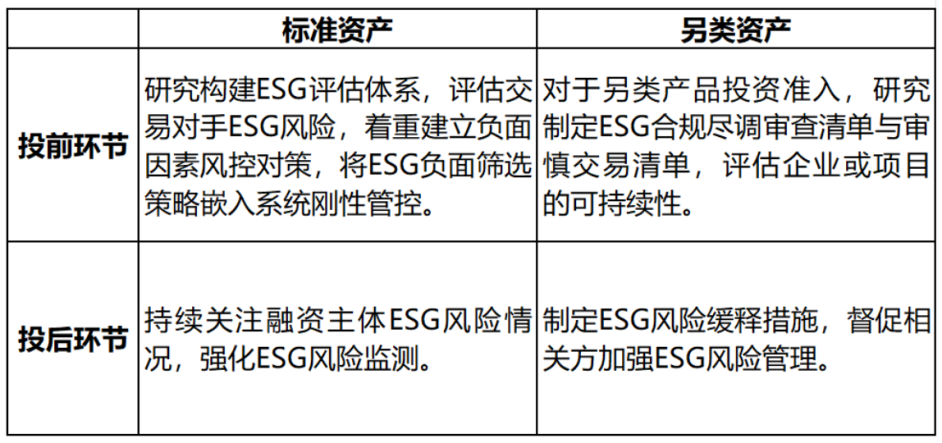 第11条 ESG纳入投资实践是指将绿色金融和ESG因素纳入投融资全流程管理,强化尽职调查、合规审查、投资审批、投后管理。