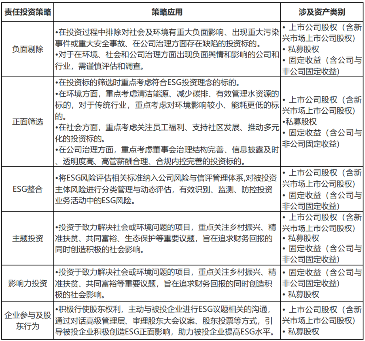 第13条 各投资子公司在制定责任投资策略时,可参考全球可持续投资联盟(GSIA)制定的七种投资方法,将ESG因素纳入投资决策,覆盖所有资产类别的投资(公司无房地产直投和对冲基金业务)。具体如下:
