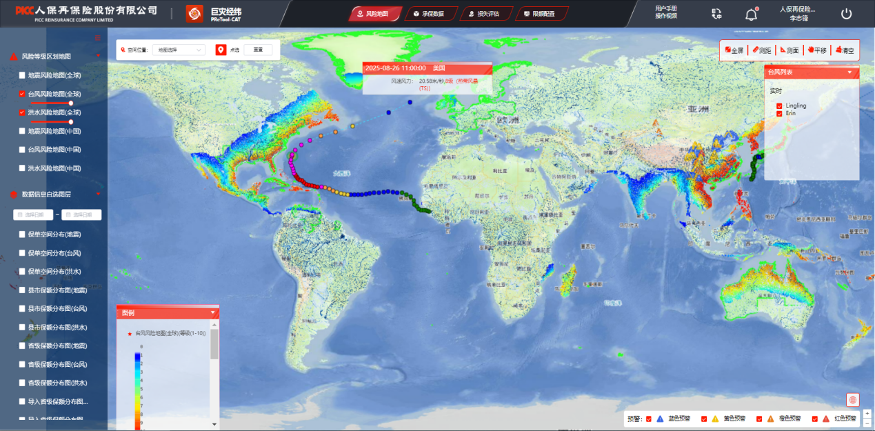“巨灾经纬国际版”从开发伊始就着眼于解决气候变化带来的巨灾风险精算管理问题。针对气候变化造成的气候巨灾参数和事件地理分布改变,从灾前气象预警、灾中实时跟踪、灾后快速估损等方面,通过精算模型构建承保能力投放算法,增强气象灾害数据和巨灾风险累积的及时性,提升气候变化条件下的巨灾风险相关精算管理能力。