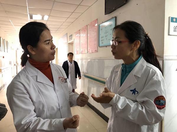 在康乐县人民医院,西安交通大学第一附属医院妇产科副主任黄谱(右)正在进行教学查房