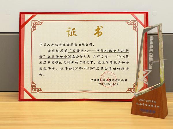 9月10日,由《中国保险报》联合中国传媒大学BBI商务品牌战略研究所共同举办的2018年度“金诺品牌”暨第三届中国保险品牌传播影响力活动在京举行。经过网络投票和专家组评审,中国人民保险集团选送的“关爱老人——中国人保黄手环行动”公益活动案例,在2019第三届中国保险品牌影响力评选中被评为2018-2019年度社会责任传播案例。
