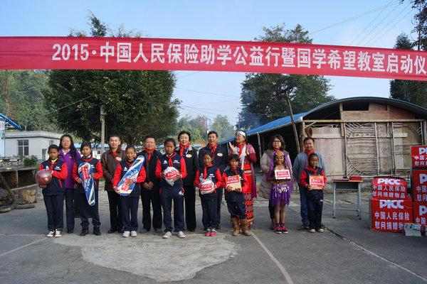 “2015·中国人民保险助学公益行暨国学希望教室”活动以弘扬国学文化、汲取国学精髓为主旨,计划在年底前为全国100 所贫困乡村小学捐助国学教室,向学生赠送国学书籍、运动服、书包、篮球、足球等体育助学用品,总计捐赠金额达200万元。