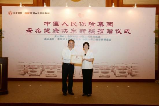 为深入贯彻落实第二次中央新疆工作座谈会议特别是习近平总书记重要讲话精神,根据全国妇联援疆工作部署,日前,由全国妇联、中国人民保险集团主办,中国妇女发展基金会、中国人保公益慈善基金会承办的中国人民保险集团“母亲健康快车”新疆捐赠仪式在京举行。全国人大常委会副委员长、全国妇联主席沈跃跃出席活动并向中国人民保险集团董事长、党委书记吴焰颁发捐赠证书。