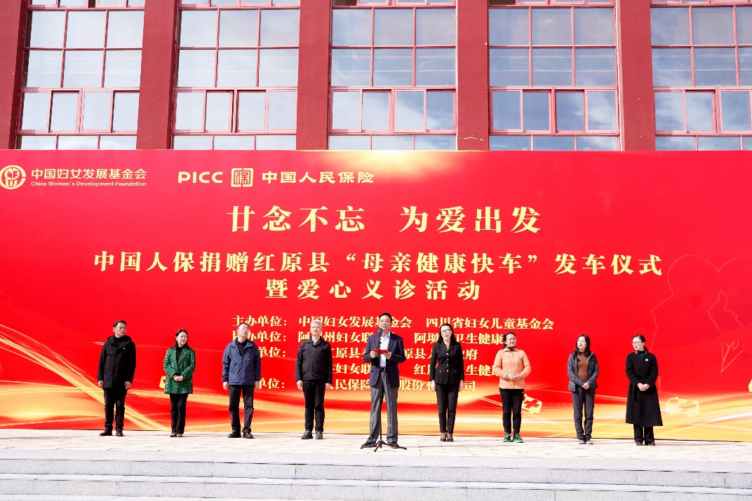 发车仪式上,中国人保公益慈善基金会理事长谢一群在致辞中表示,妇女儿童事业是党和国家事业的重要组成部分。妇女儿童健康关系到家庭幸福和国家未来,也是中国人民保险和基金会的重点关注领域之一。自2013年以来,中国人民保险携手中国妇基会开展“母亲健康快车”项目,以实际行动践行“人民保险 服务人民”的初心使命。今天,与中国妇基会再度携手走进红原县,开展捐赠“母亲健康快车”暨爱心义诊活动,用实际行动助力改善红原县妇女儿童医疗条件,守护全县妇女儿童的健康安宁。