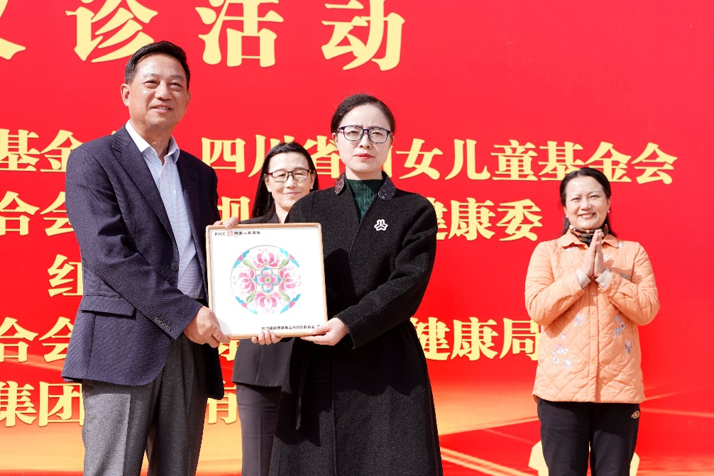 中国妇女发展基金会副理事长王银香、四川省妇联党组成员、副主席李敏在致辞中对中国人民保险长期以来对妇女公益事业的大力支持表示感谢!阿坝州妇联向中国人民保险赠送羌族刺绣团花“羊角花”。
